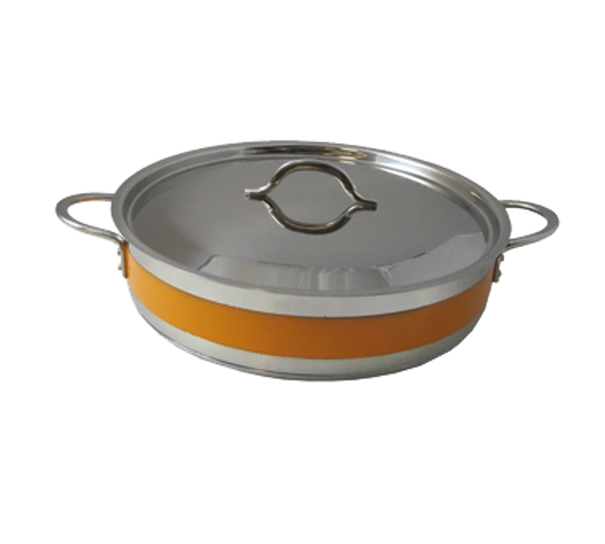 Classic Country French Pot, 9 qt., 14-3/4″ dia. x 3-3/8″H, round, with cover, handled, induction bottom, stainless steel, orange, NSF