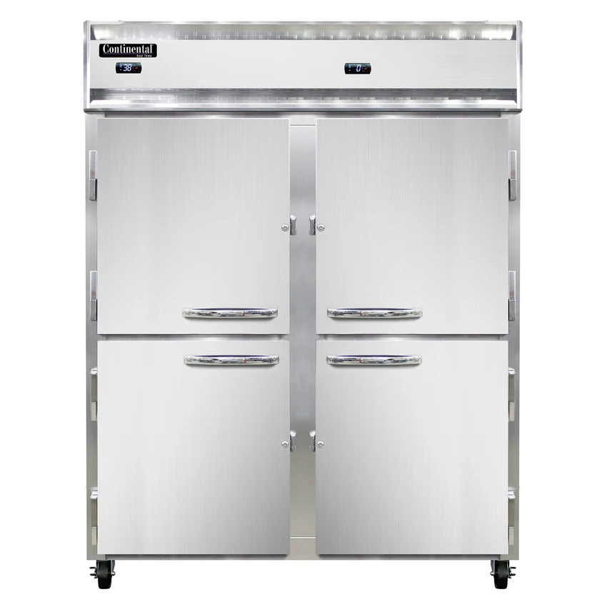Extra-Wide Refrigerator/Freezer, reach-in, 57″W, two-section, self-contained refrigeration, stainless steel exterior & interior, standard depth, (4) half-height solid self-closing doors, cylinder locks, electronic control with digital display, hi-low alarm & hi-low alarm, LED interior lighting, (6) epoxy-coated steel shelves, electric condensate evaporator, dual 1/4 & 1/3 HP, cETLus, NSF, Made in USA