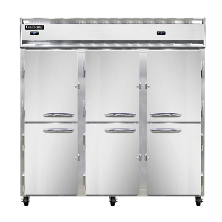 Refrigerator/Freezer, reach-in, three-section, self-contained refrigeration, stainless steel front, aluminum interior & ends, standard depth, half-height solid doors, cylinder locks, electronic control with digital display, hi-low alarm, electric condensate evaporator, dual 1/4 & 1/2 HP
