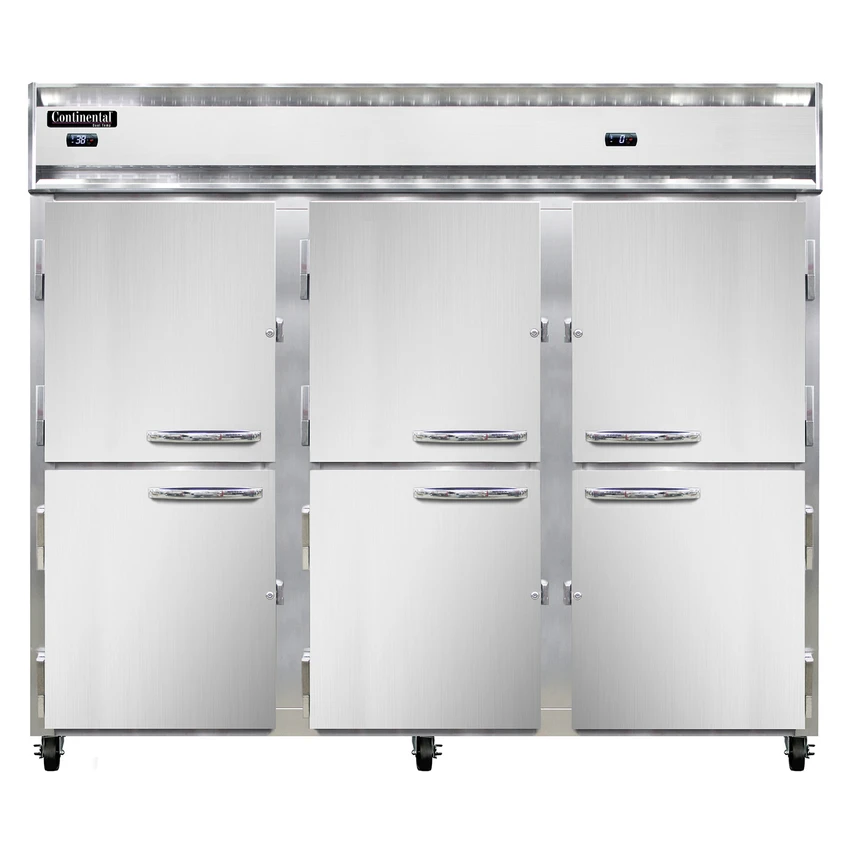 Extra-Wide Refrigerator/Freezer, reach-in, 85-1/2″W, three-section, self-contained refrigeration, stainless steel exterior & interior, standard depth, half-height solid doors, cylinder locks, electronic control with digital display, hi-low alarm, electric condensate evaporator, dual 1/4 & 1/2 HP