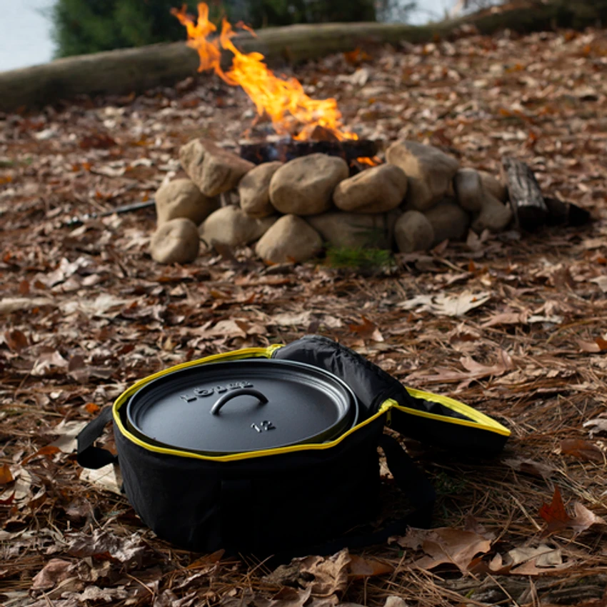 The AT-12 Camp Dutch Oven Tote made by Lodge has padded Velcro® handles and comes complete with carry straps. It features padded side walls, base, and lid and has a convenient self-healing zipper. It is also made of weather-resistant polyester with a PVC back for extra durability and rigidity.