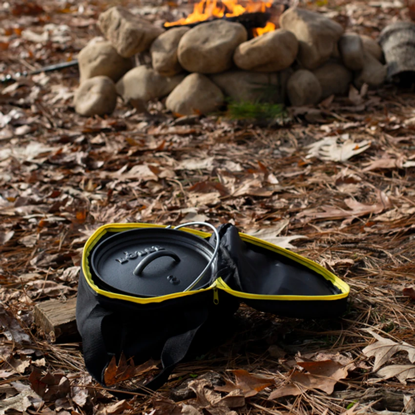 The AT-8 Camp Dutch Oven Tote made by Lodge has padded Velcro® handles and comes complete with carry straps. It features padded side walls, base, and lid and has a convenient self-healing zipper. It is also made of weather-resistant polyester with PVC back for extra durability and rigidity.