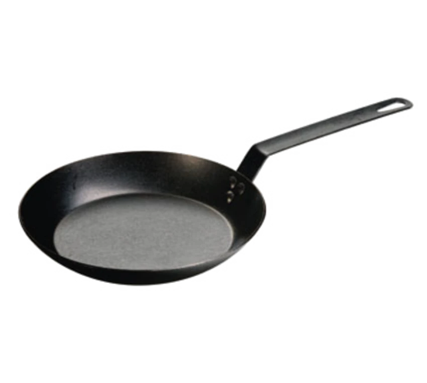 Skillet, 10-5/16″ dia. x 3-5/16″H (exterior), riveted handle, stove top/induction/grill/campfire/oven safe, seasoned with oil, hand wash only, heavy gauge carbon steel, Made in USA
