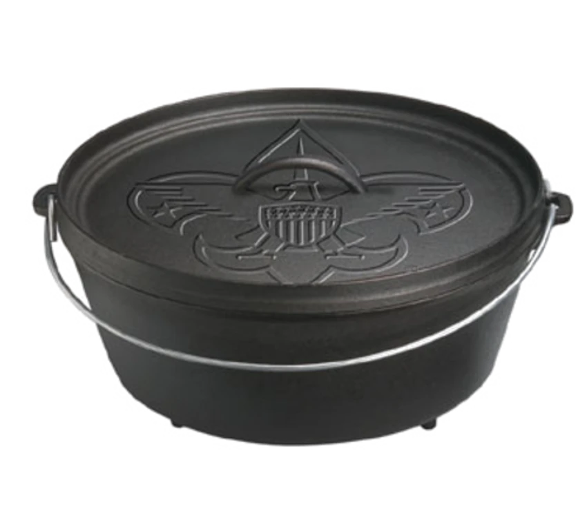 Boy Scout Camp Dutch Oven, 6 quart, 13-1/4″ dia. x 7-3/8″H (exterior), officially licensed, fleur-de-lis engraved flanged lid can be used to hold coals/briquettes (flip lid to use as griddle), (3) integral legs (fire safe), wire bail handle (for use with tripod), includes: Camp Dutch Oven Cooking 101 cookbook, stove top/grill/campfire/oven safe, seasoned with oil, hand wash only, cast iron, Made in USA