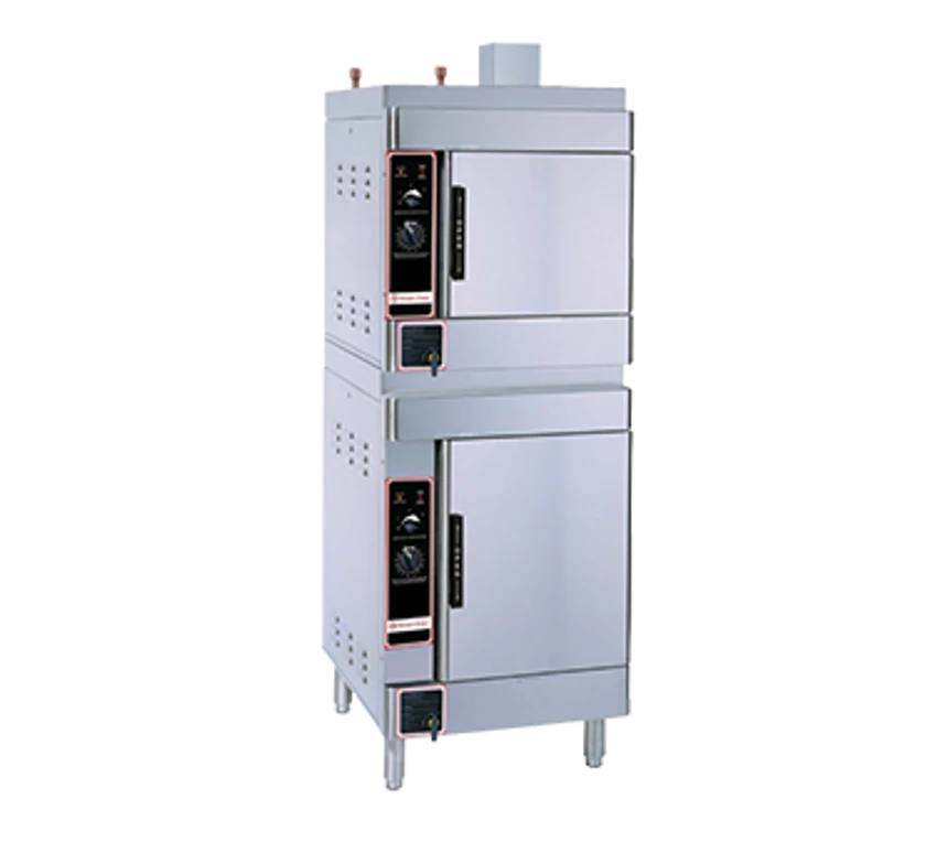 Sirius II convection Steamer, LP, (2) compartments, (4 & 6) 12″ x 20″ pan capacity per compartment, LP or Nat gas boilerless, auto water system, manual controls, aluminum cast cooking compartment, stainless steel exterior, preheated incoming water, clean water reservoir system, 6-9″legs, (2) 120V/60/1-PH, UL, ENERGY STAR®