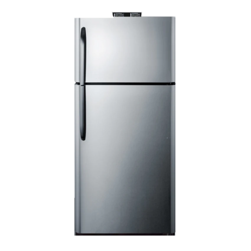 Break Room Refrigerator-Freezer, 29.63″W x 31.75″D x 70.38″H, 21 cu. ft. capacity, frost-free, reversible stainless steel doors, black exterior finish, sealed back, exterior mounted NIST certified thermometer for each section, high/low temperature alarm, adjustable glass shelves, gallon door storage, crispers, interior light, 115v/60/1-ph, 6.0 amps, CSA (Residential)