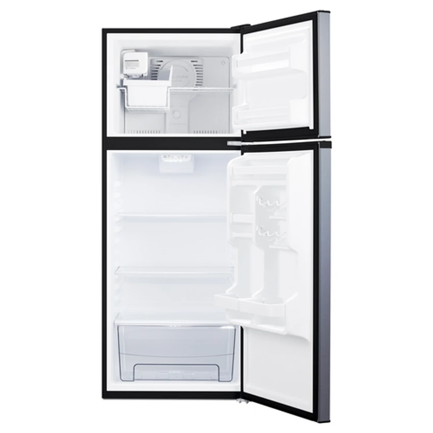 Summit Refrigerator/Top Mount Freezer, 10 cu. ft., 23-1/2″W, factory-installed icemaker, reversible doors, adjustable glass shelves, door storage, gallon door shelf, crisper, frost-free, sealed back, stainless steel look, black cabinet, R600a refrigerant, 115v/60/1-ph, cULus (Household)