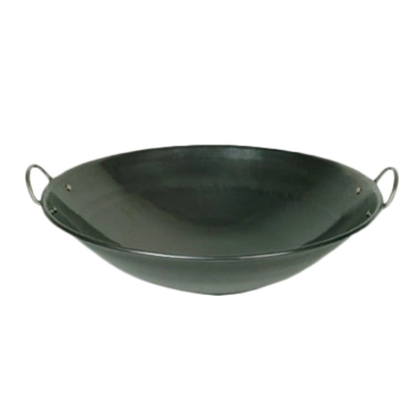 Wok, 24″ dia., curved rim, 2 round riveted handles, iron construction