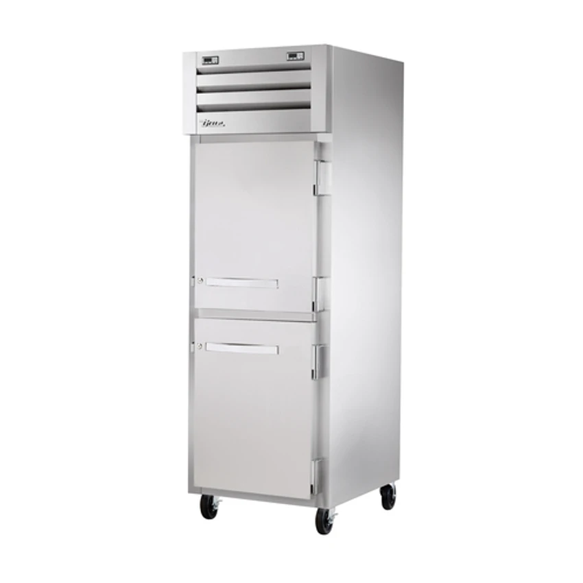 SPEC SERIES® Refrigerator/Freezer, reach-in, one-section, (2) stainless steel half doors, locks, cam-lift hinges, digital temperature control, (3) gray shelves, LED interior lights, stainless steel front, aluminum sides, aluminum interior, 5″ castors, R290 Hydrocarbon refrigerant, R 1/10HP, F 1/4HP, 115v/60/1-ph, 3.7 amps, NEMA 5-15P, cULus, UL EPH Classified, Made in USA