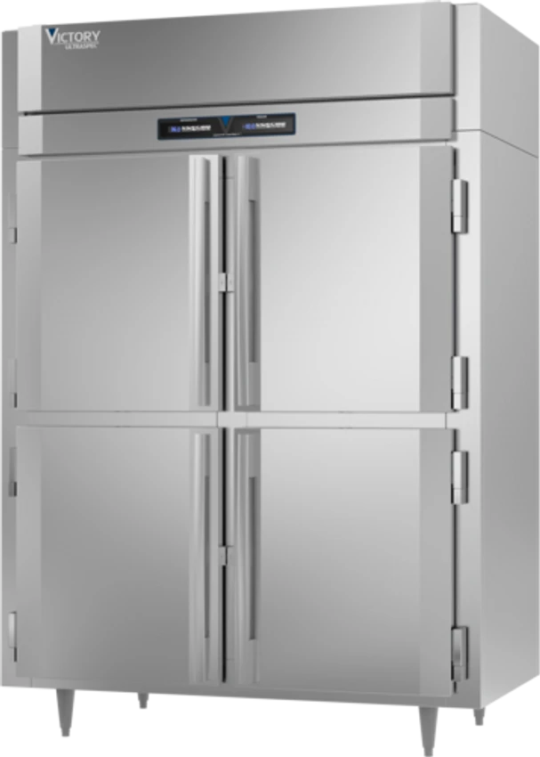 UltraSpecâ„¢ Series Refrigerator/Freezer, Pass-thru, two-section, self-contained refrigeration, 26.06 cu. ft. capacity per section, (8) wide half height solid hinged doors, (6) silver freeze (chrome-style) wire shelves, stainless steel exterior, aluminum interior, standard depth cabinet, TOUCH POINTâ„¢ electronic temperature control/indicators, LED lighting, expansion valve technology, Santoprene door gaskets with 2 year warranty, stainless steel breakers, top mounted compressors, refrigerator 1/3 HP & freezer 3/4 HP, cULus, UL EPH Classified, UL-Sanitation, MADE IN USA