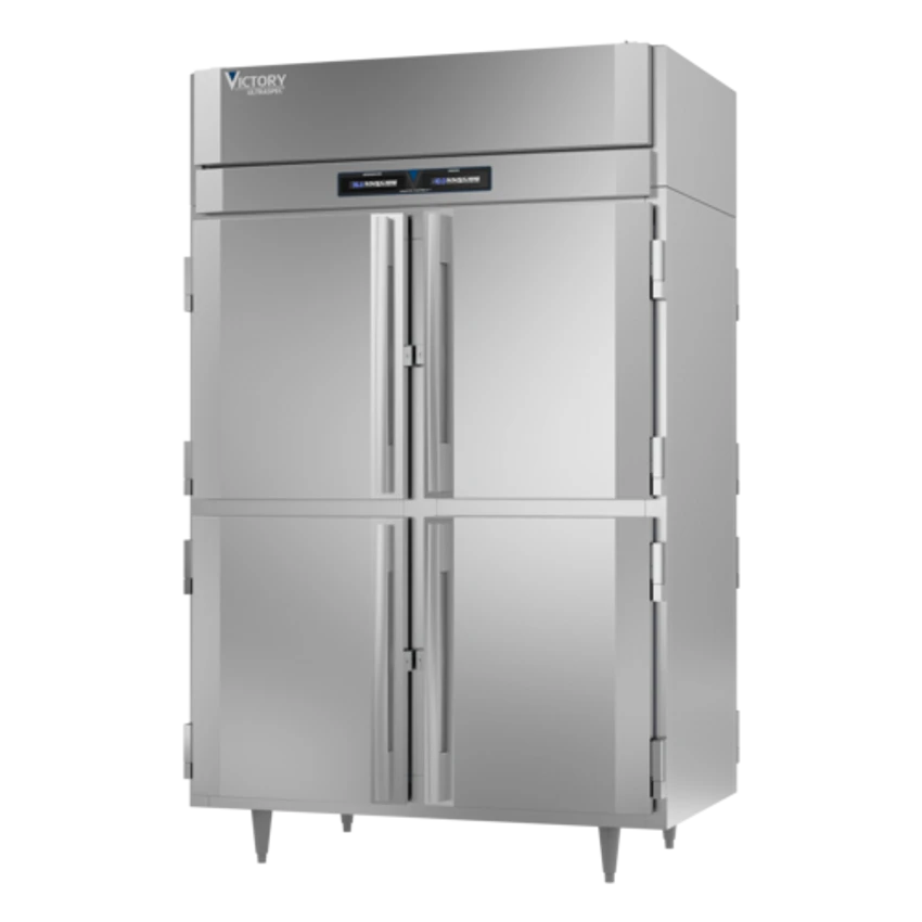 UltraSpecâ„¢ Series Refrigerator/Freezer, Pass-thru, two-section, self-contained refrigeration, 22.9 cu. ft. capacity per section, (8) half height solid hinged doors, (6) silver freeze (chrome-style) wire shelves, stainless steel exterior, aluminum interior, standard depth cabinet, TOUCH POINTâ„¢ electronic temperature control/indicators, LED lighting, expansion valve technology, Santoprene door gaskets with 2 year warranty, stainless steel breakers, top mounted compressors, refrigerator 1/3 HP & freezer 3/4 HP, cULus, UL EPH Classified, UL-Sanitation, MADE IN USA